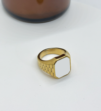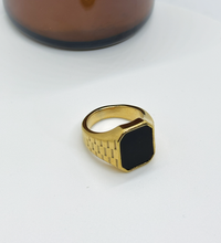 Our Onyx Diva Ring is a powerful statement piece that blends modern structure with classic heritage. This striking gold-toned ring features a smooth enaonyx-look square center, set upon a band with distinctive watchband-style engraved links on the sides. It delivers a substantial, luxurious feel perfect for everyday confidence and authority.