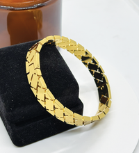 Our Tessellation Cuff is a captivating piece designed to make a dramatic impact. This substantial, gold-toned bracelet features intricate, interlocking geometric links that create a continuous, textured pattern. The angular, structured design catches the light from every direction, providing unmatched brilliance and a high-end, powerful aesthetic.