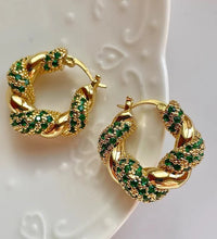 Emerald Twist Huggie Hoops are a vibrant and opulent take on the classic gold hoop. These chunky huggies feature a bold, twisted rope design, with one strand paved entirely in brilliant green cubic zirconia gemstones. The contrasting gold and emerald create a striking, spirited look perfect for adding a pop of color and rich texture to any outfit.