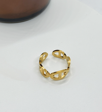 Link Cuff Ring offers a unique, geometric statement with a subtle nautical edge. This gold-toned cuff ring is crafted from continuous, interconnected oval or 'anchor' style links, creating a bold, openwork band. The cut-out design provides texture and breathability, while the open cuff back ensures an adjustable and comfortable fit.